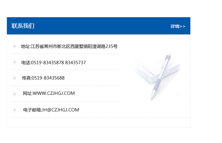 地址:常州市新北區友邦商務大廈1幢16、17層  電話:0519-85101652  傳真:0519-85112595  郵編:213022  網址:www.cz-jiayue_cn.sdjltj.com  郵箱:xiajifengaa@163.com